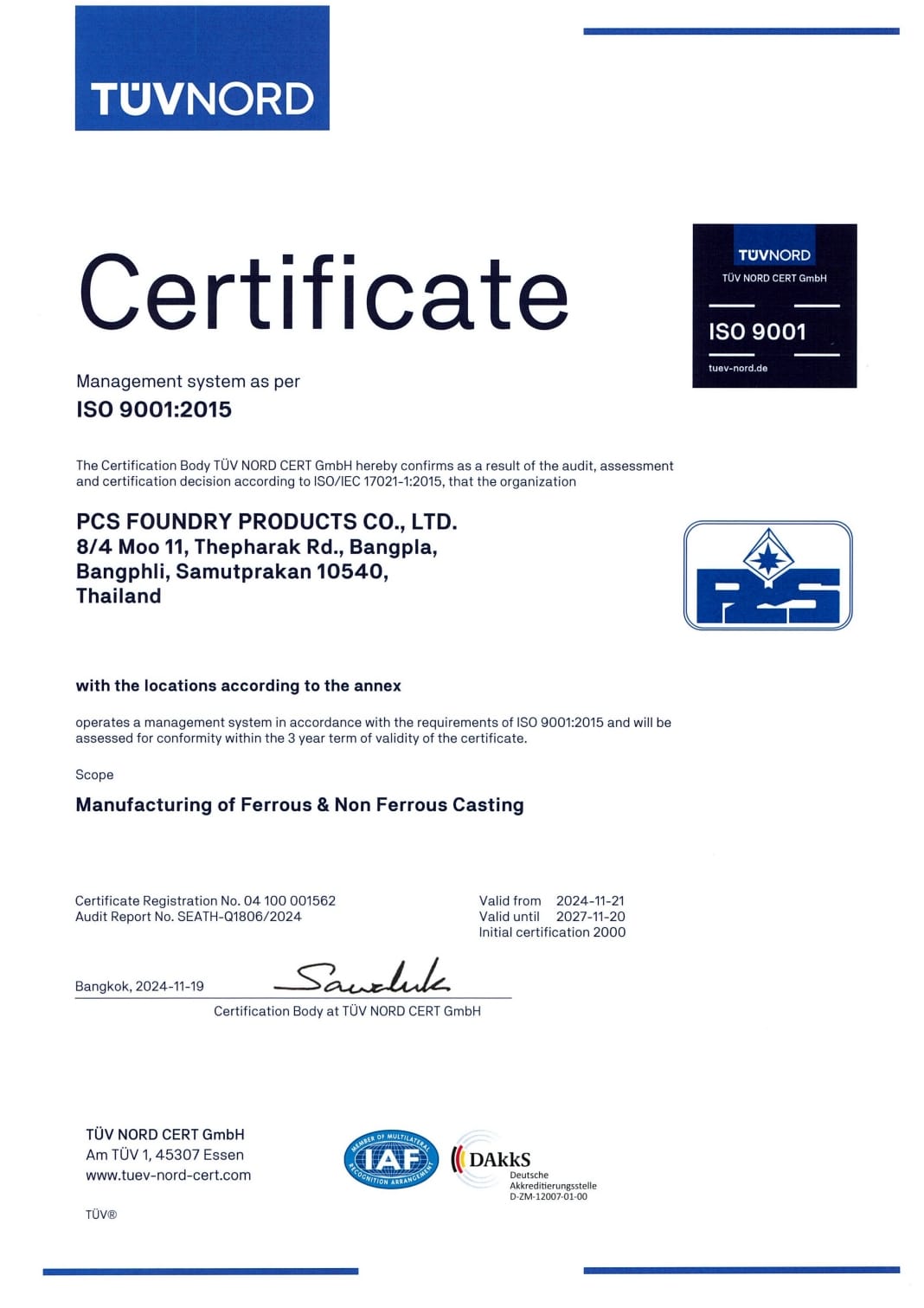 The current revision of ISO 9001:2015 was successfully certified by TÜV NORD Thailand in November 2024, and